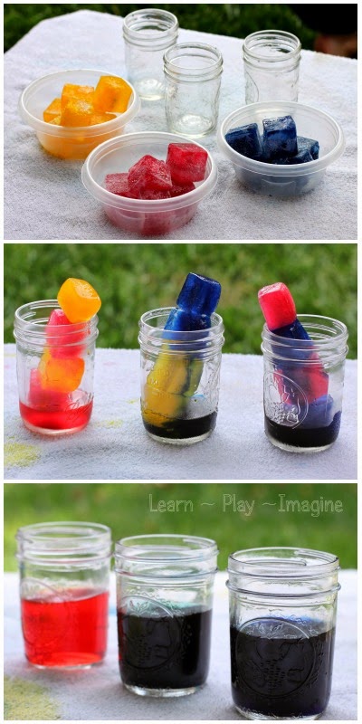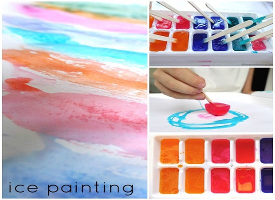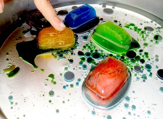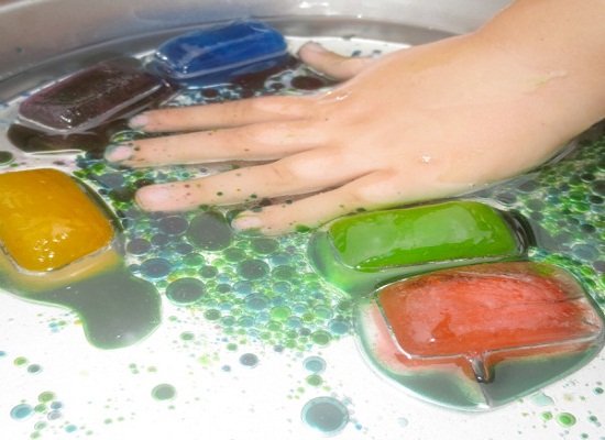 - Hãy để các viên đá màu vào 1 khay với 1 lớp dầu. Và hãy để bé theo dõi sự tan chảy của đá thành nước và dầu như thế nào.