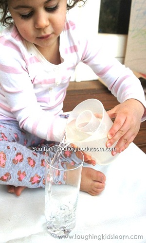 Đơn giản chỉ cần dạy bé đổ nước vào lọ và để thừa một ít trên một khoảng gần nắp bình
