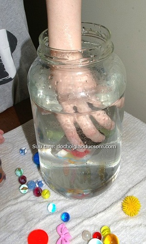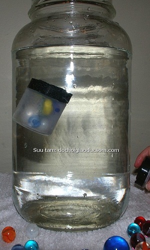 Những vật nhỏ sẽ được sử dụng làm và hộp nhựa sẽ là những con tàu điện ngầm. Bé chỉ cần cho những viên bi, những quả bóng bé hoặc những vật nhỏ vào trong chiếc hộp nhựa. Sau đó thả vào bình nước, như vậy bé đã có một chiếc tàu ngầm dưới nước rồi.