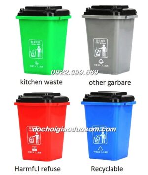 – Bộ sản phẩm thùng phân loại rác bao gồm 4 thùng đựng rác có ký hiệu, chữ tiếng anh, tiếng trung thể hiện 4 loại rác cơ bản ( Rác thải hữu cơ, rác thải tái chế, rác thải không phân hủy, rác thải khác…)