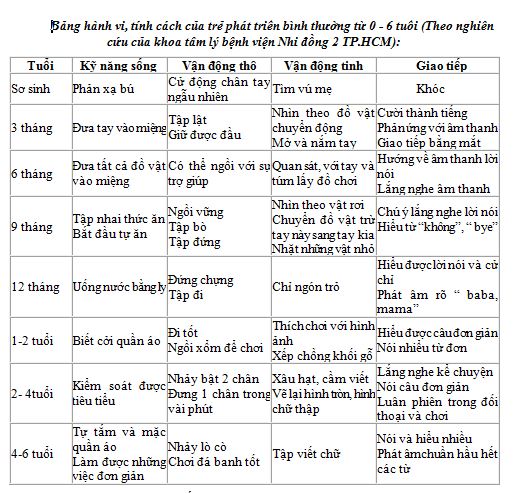 Bảng hành vi, tính cách của trẻ phát triển bình thường từ 0 – 6 tuổi (Theo nghiên cứu của khoa tâm lý bệnh viện Nhi đồng 2 TP.HCM):