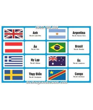 – 64 thẻ hình với mặt chính là hình quốc kỳ các nước, mặt sau là tên tương ứng với lá quốc kỳ và thủ đô các nước đó. Qua đó, giúp trẻ nâng cao hiểu biết về các quốc gia, cũng như thủ đô các nước.