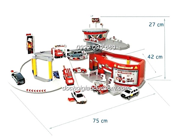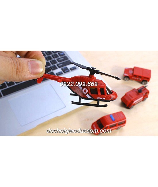 Bộ sản phẩm gồm: Mô hình như ảnh và 4 chiếc xe cứu hỏa mầu đỏ (1 trực thăng, và 3 loại ô tô)