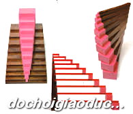 Tháp hồng được sử dụng để dạy trẻ những khái niệm lớn và nhỏ thông qua các giác quan. Các cầu thang màu nâu được sử dụng để dạy các khái niệm về dày và mỏng.Các hoạt động này giúp nhận thức thị giác của trẻ trong việc đánh giá các kích cỡ. Phát triển sự phối hợp, kỹ năng vận động tốt và phát triển ngôn ngữ. Ngoài ra, còn giúp trẻ hình thành khả năng toán học và hình học từ sớm.