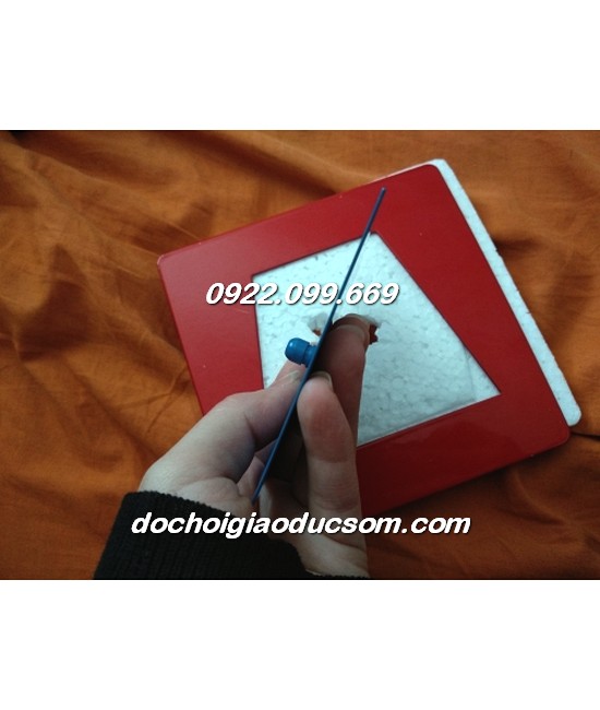 Đặt khay tập viết và 3 cây bút chì có màu sắc khác nhau lên mặt bàn. Lấy miếng kim loại hình vuông màu đỏ đặt lên trang giấy trắng và hướng dẫn trẻ cầm bút chì màu vẽ 1 hình chữ nhật theo đường khuôn trong lòng hình vuông đỏ đó. Sau khi trẻ vẽ xong hình chữ nhật thì nhấc hình vuông đỏ ra. Sau đó, hướng dẫn trẻ cầm lấy miếng kim loại hình chữ nhật màu xanh đặt vào đúng vị trí của hình chữ nhật vừa được vẽ trên giấy lấy bút chì màu vàng tô lại. Sau đó nhấc miếng kim loại màu xanh ra và cho trẻ dùng bút chì màu xanh viết hoặc vẽ những gì trẻ muốn nhưng chỉ ở phía trong của hình chữ nhật vừa vẽ.