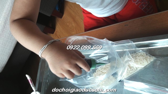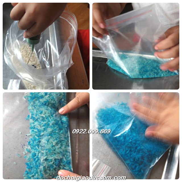 Sau đó đóng kín miệng túi lại. Mẹ và con bắt đầu nhào, vò , xào xáo gạo lên đều với mầu thực phẩm. Quá trình này có thể làm từ từ, vừa làm, vừa chỉ cho con thấy, à, hạt gạo này chuyển mầu rồi con này! Chỗ này vẫn còn trắng, mình cần thêm mầu vào, mình cần nhào kỹ hơn nhé!