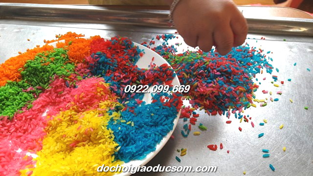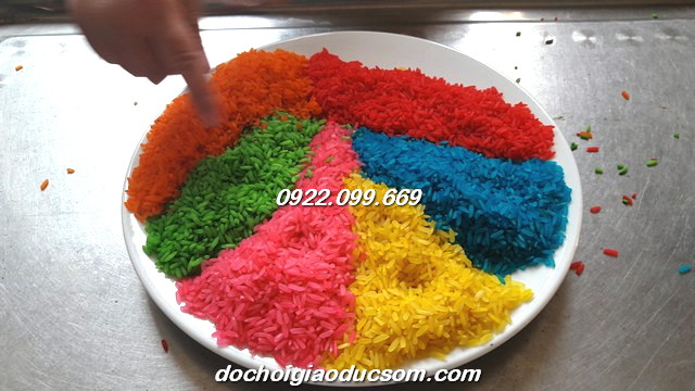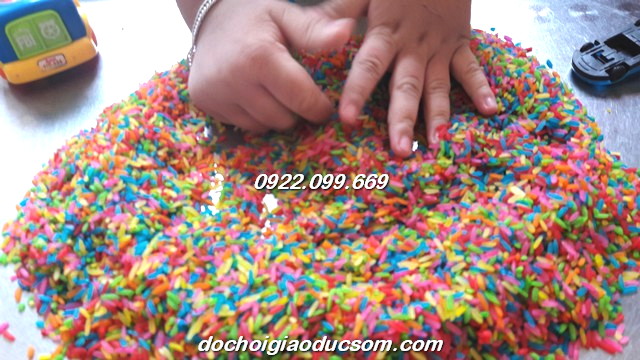 Con đếm xem mấy mầu gạo nào? Con lấy cho mẹ 1 hạt gạo đỏ nào? Lấy cho mẹ 5 hạt gạo xanh lá cây nhé? …