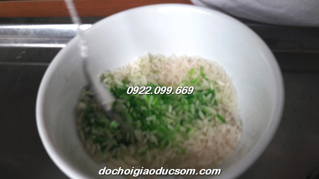 Ôi, mầu này đậm quá, mẹ cho thêm gạo trắng để bớt đậm nhé. Đảo đều nào!