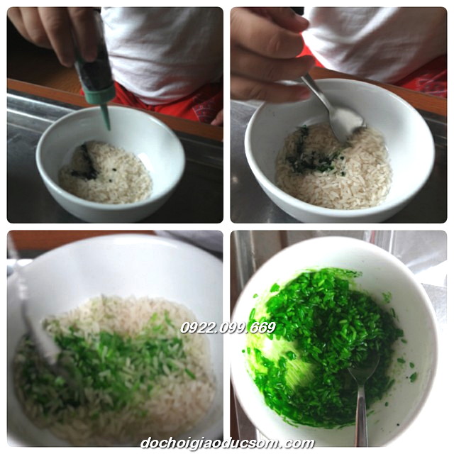 Cho mầu vào các bát con chứa gạo, dùng thìa đảo đều lên, cho mầu trộn đều với mầu, càng đều càng tốt. chỗ nào trắng cũng chỉ cho con, để con biết đảo kỹ hơn, hoặc cho thêm mầu.