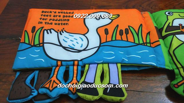 - Sách vải “Whose feet? cũng là 1 sản phẩm thông minh của jolly baby. thiết kế sách thông minh có thể mở rộng tới 60cm, có tiếng sột soạt ở từng đôi chân và bóp chút chít ở miệng cá sấu.
